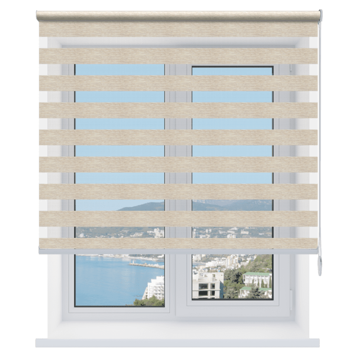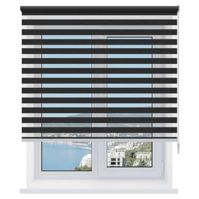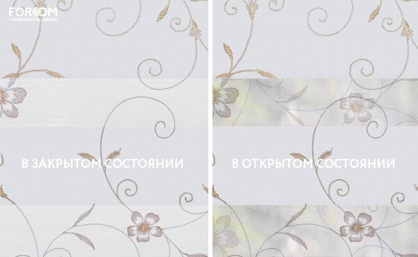 Каждый слой ткани имеет чередующиеся непрозрачные и прозрачные полосы. При смещении полос друг относительно друга можно добиться полного затемнения («ночь», когда непрозрачные полосы совпадают), максимального светопропускания («день», когда совпадают прозрачные полосы) или промежуточных режимов, создавая эффект «зебра».
