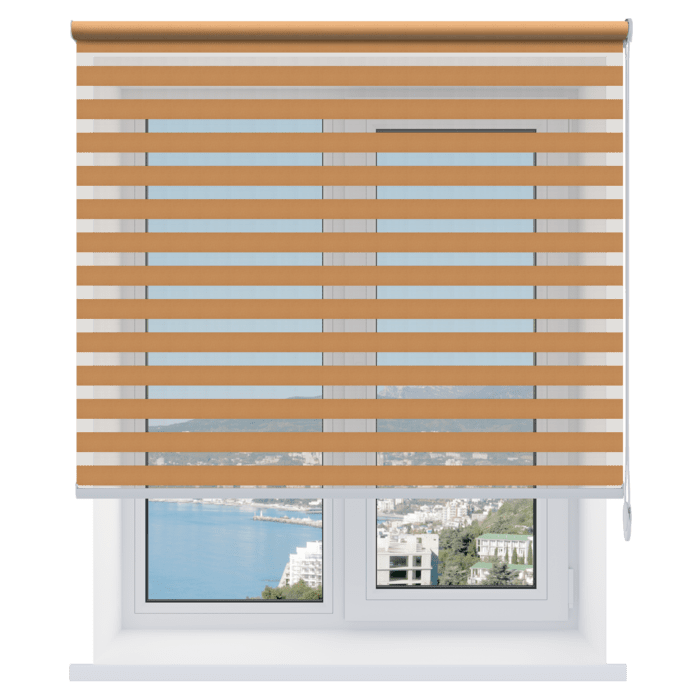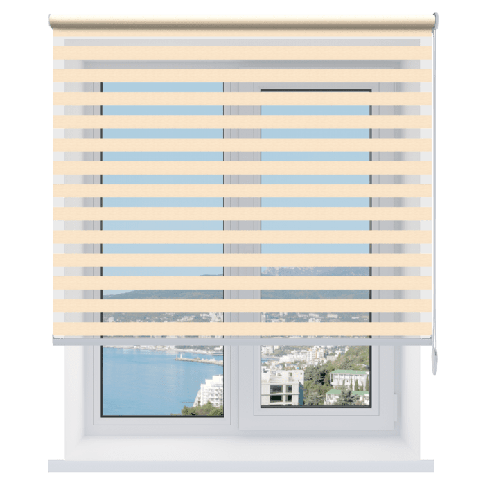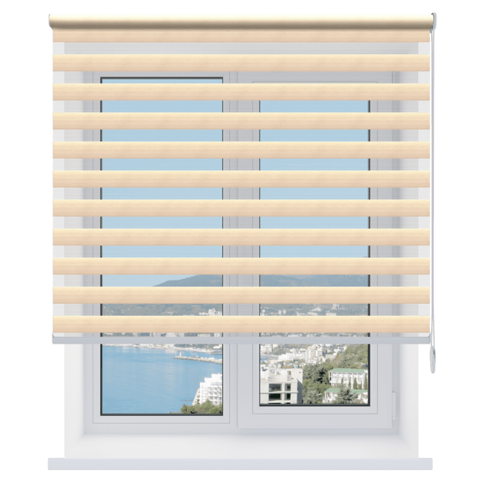 Открытые рулонные шторы «день-ночь» – солнцезащитные системы, состоящие из полотна (состоит из двух слоев ткани с прозрачными и непрозрачными полосами), которое при подъеме наматывается на вал без короба. Такие модели рольштор стоят дешевле закрытых, но ткань на валу остается открытой и не защищена от пыли.
